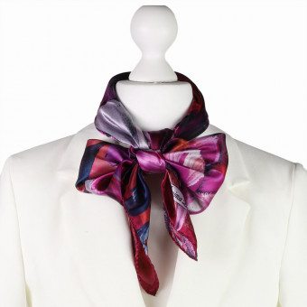Dzięki intensywnym barwom – od głębokiego fioletu po soczysty róż i akcenty pomarańczu – apaszka doskonale komponuje się zarówno z jasnymi, jak i ciemnymi ubraniami. Może być noszona klasycznie na szyi, przewiązana na torebce, a nawet jako ozdobna opaska we włosach.
