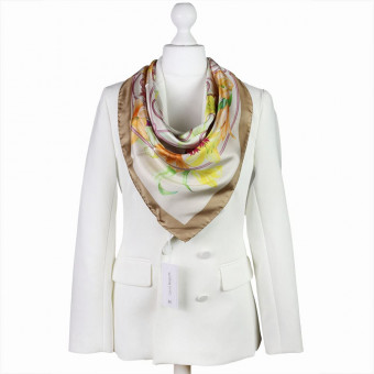 Kolorowy wzór inspirowany kwiatami w odcieniach żółci, różu, pomarańczu i zieleni, na tle w odcieniu ciepłego kremu i beżu, dodaje świeżości oraz elegancji. Apaszka świetnie komponuje się zarówno z jasnymi, jak i ciemniejszymi elementami garderoby, tworząc spójną i stylową całość.
