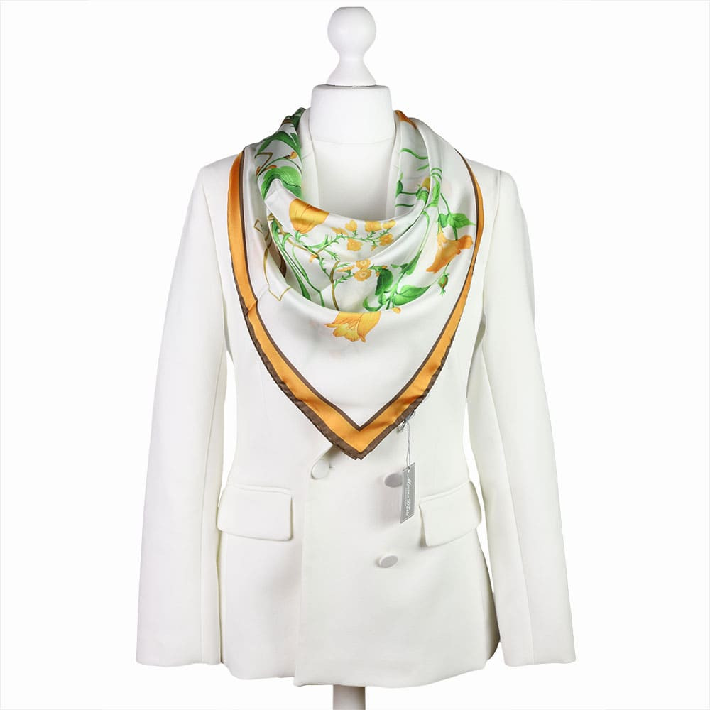 Kolorowy wzór inspirowany kwiatami w odcieniach żółci, pomarańczu i zieleni, na tle w odcieniu ciepłego kremu i beżu, dodaje świeżości oraz elegancji. Apaszka świetnie komponuje się zarówno z jasnymi, jak i ciemniejszymi elementami garderoby, tworząc spójną i stylową całość.