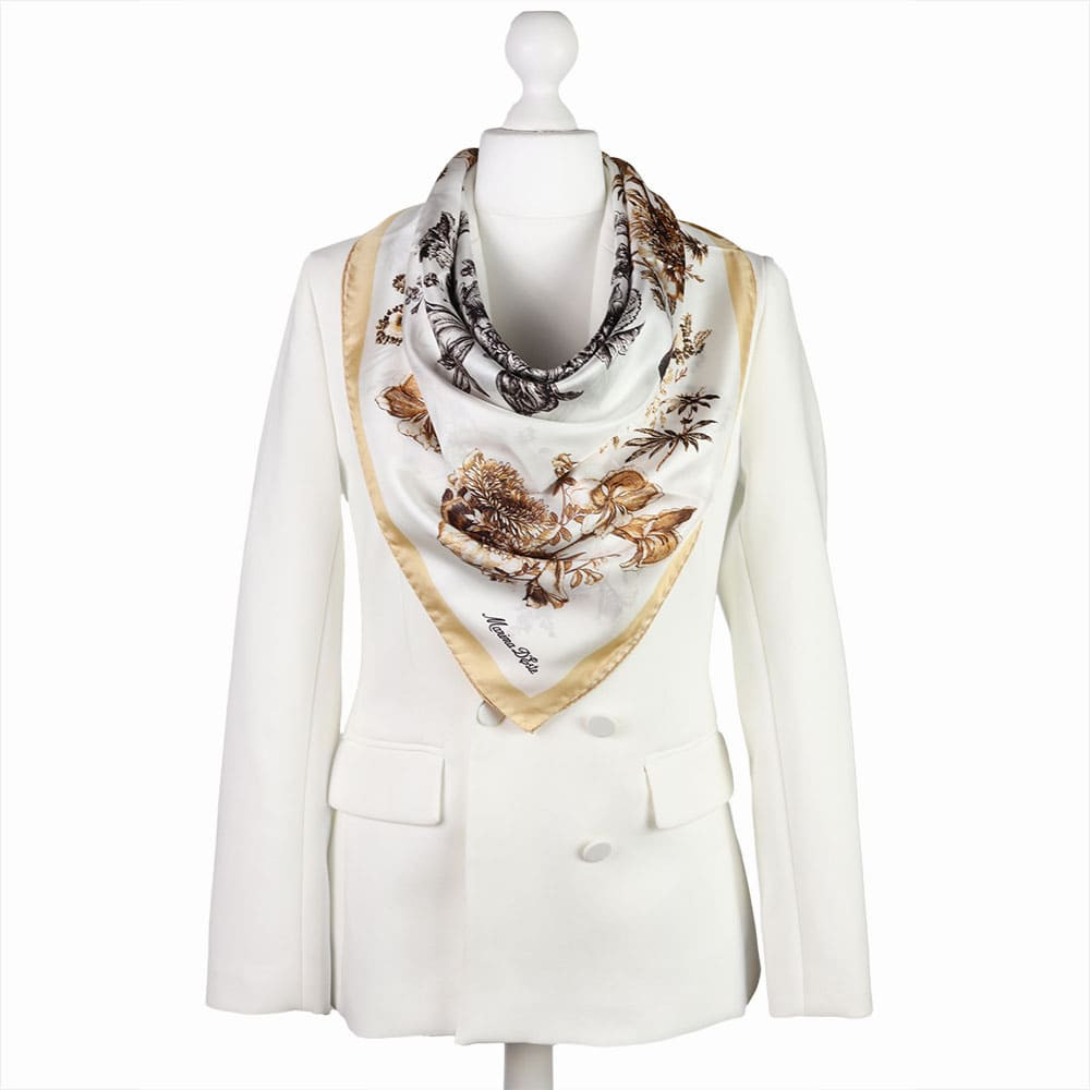Ta elegancka apaszka z jedwabiu naturalnego 90x90cm zachwyca subtelnym połączeniem bieli, sepii i brązu, dzięki czemu z łatwością wpisuje się w klasyczne i nowoczesne stylizacje. Kwiatowy wzór dodaje jej delikatności, natomiast ręcznie wykończone rolowane brzegi podkreślają jakość wykonania. Świetnie sprawdzi się zarówno jako szykowny dodatek do żakietu, jak i element codziennego ubioru. Apaszka jedwabna w jasnej tonacji to doskonały wybór na prezent lub wyjątkowy akcent dla Twojej garderoby.